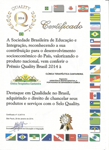 A Sociedade Brasileira de Educação e Integração, reconhecendo a sua contribuição para o desenvolvimento socieconômico do país, valorizando o produto nacional, vem conferir o Prêmio Quality Brasil 2014 à Clínica Terapêutica Cantareira.